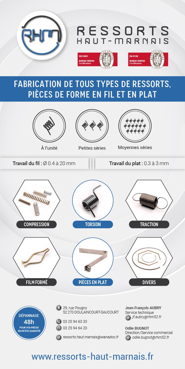 Fabricant de ressorts, pièces de forme en fil et en feuillard en petite et moyenne série, sur mesure, ISO 9001 et EN9100. Travail du fil de Ø 0.4 à 20mm et plat d'ép.0.3 à 3 mm.